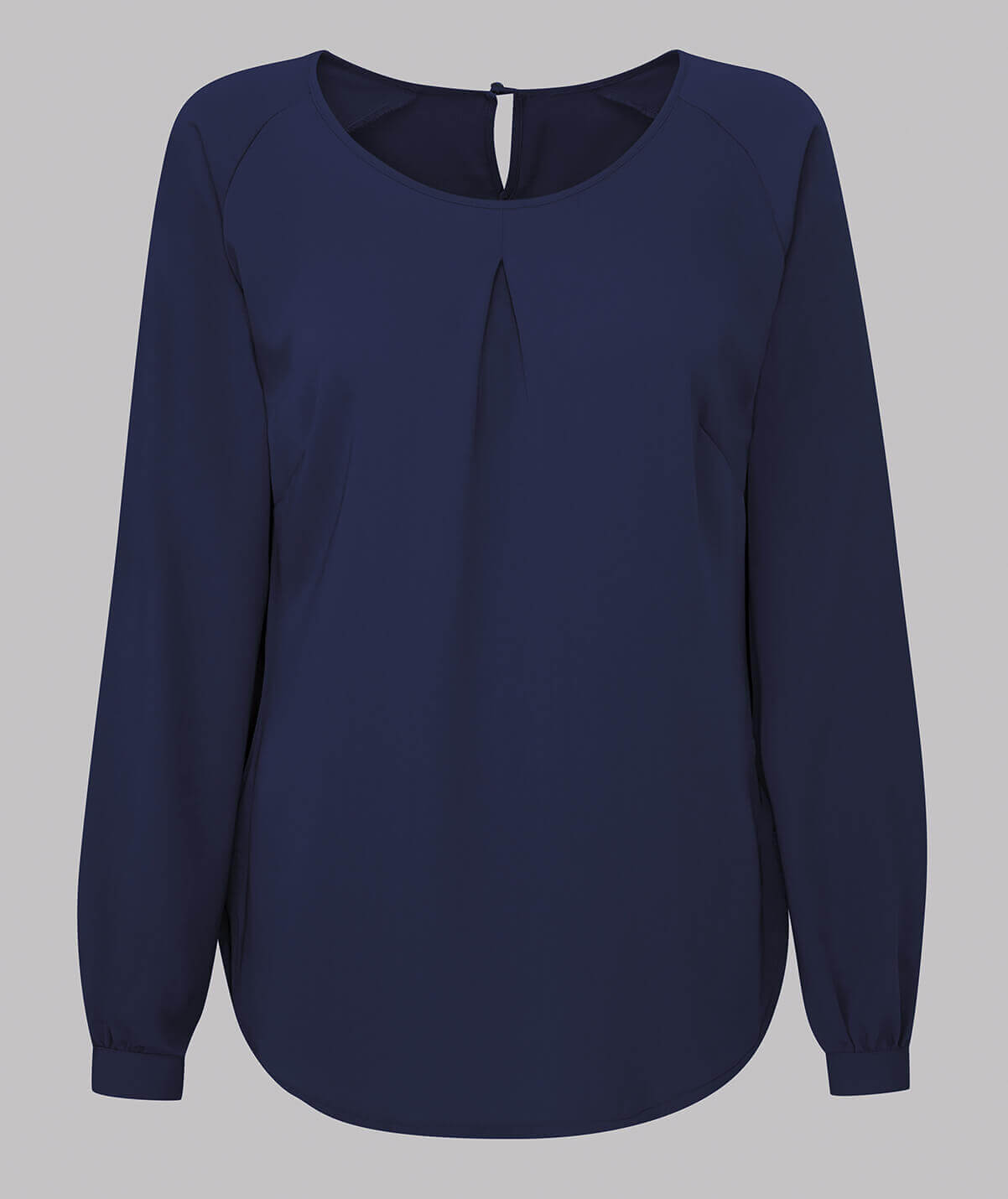 The Mona round neck work blouse- a gracefully shaped, relaxed fit blouse with an inverted front pleat & scooped hem. The soft, fluid fabric ensures comfort & style throughout the day. 100% Polyester